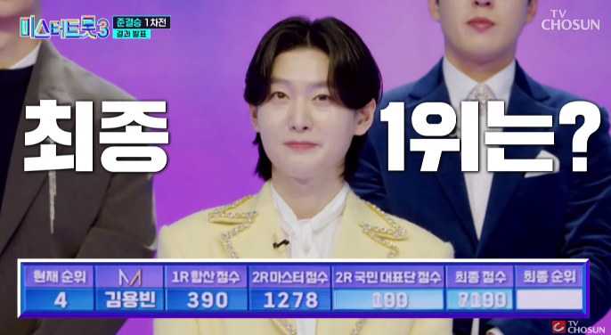 손빈아의 뒤를 이어 2위 자리에는 김용빈과 춘길이 이름을 나란히 올렸습니다. 두 사람 모두 뛰어난 가창력과 독창적인 해석을 보여주면서 상위권에 안착했는데요. 특히 김용빈은 중간 순위가 다소 낮았음에도 팬덤의 온라인 응원 투표와 뛰어난 무대 퍼포먼스로 점수를 끌어올려 준결승1차전을 성공적으로 마쳤습니다. 춘길 역시 ‘정통 트롯 계보를 잇는다’는 평가를 받을 정도로 안정된 기량을 뽐내면서 시청자와 마스터를 동시에 사로잡았습니다.