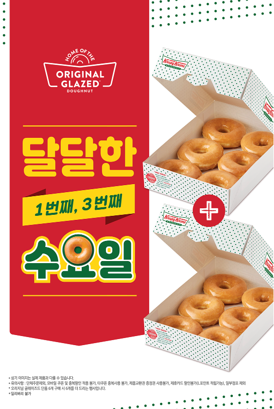 매주 수요일, 단 하루! 도넛 덕후라면 절대 놓쳐선 안 될 크리스피 크림 도넛의 수요일 1+1 이벤트를 소개합니다. 특히 매월 1번째, 3번째 수요일마다만 열리는 한정 이벤트로, 달콤한 오리지널 글레이즈드 도넛을 6개 가격으로 12개나 가져갈 수 있는 절호의 기회예요!