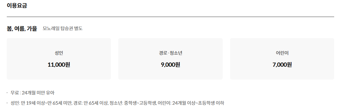 | 모노레일 (순환 전체 구간) | 성인 9,000원 / 어린이 7,000원 |